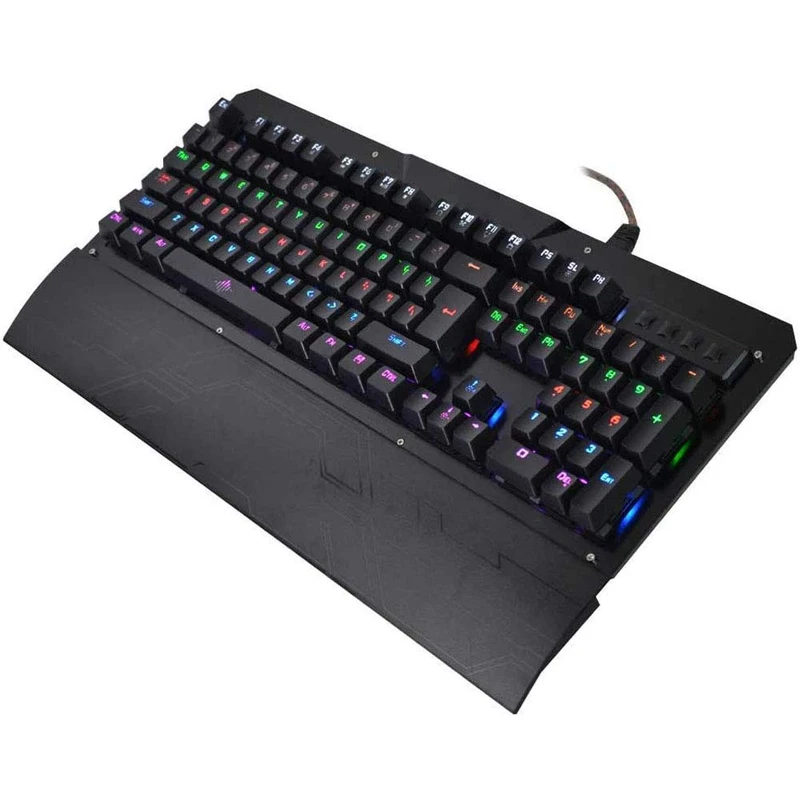 سایر قابلیتهای صفحه کلید دارای قابلیت آنتی گوستینگ دارای نورپردازی چند رنگ با افکت های گوناگون سوییچ های مکانیکی به رنگ آبی با عمر 50 میلیون ضربه کابل کنفی بدون حروف فارسی دارای پد استراحتگاه مچ دست جدا شونده