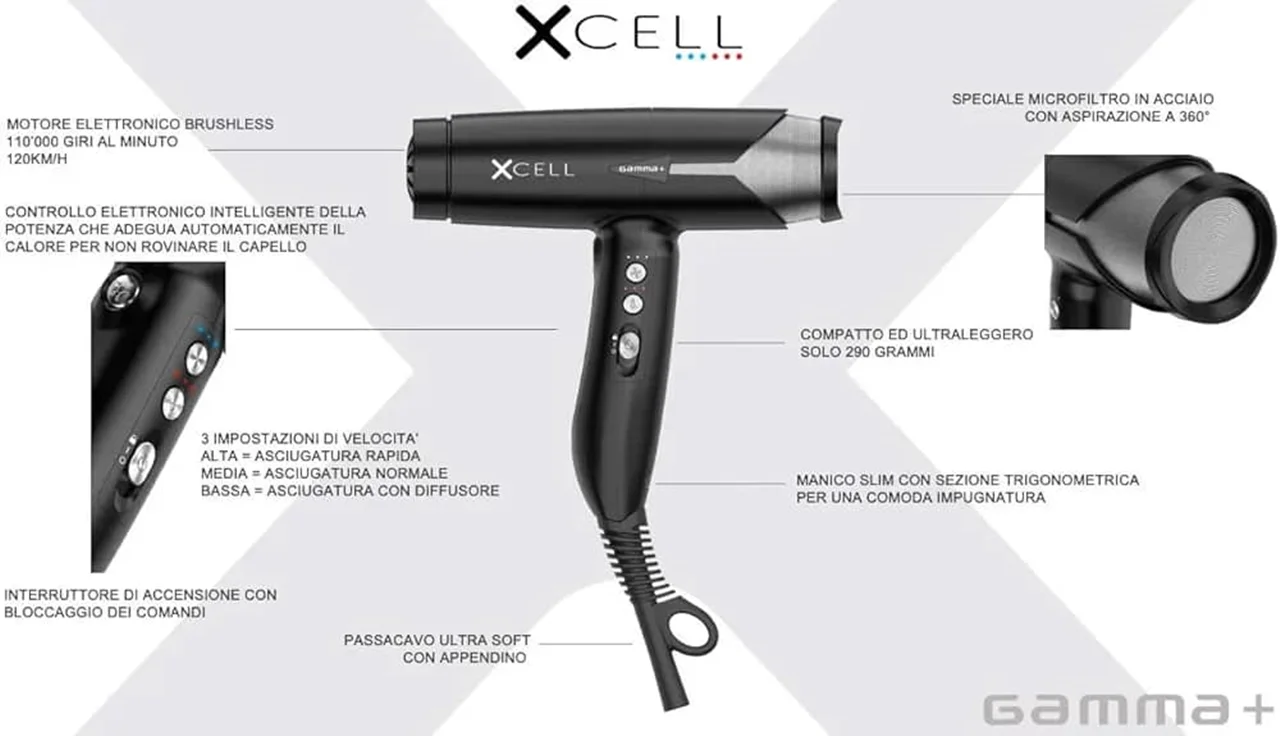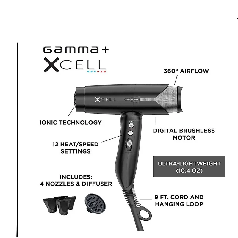 سشوار حرفهای XCELL مجهز به 4 نازل با قابلیت اتصال آسان با اتصال ضربهگیر، برای مقابله با وز مو و 1 پخشکننده حرفهای همراه است