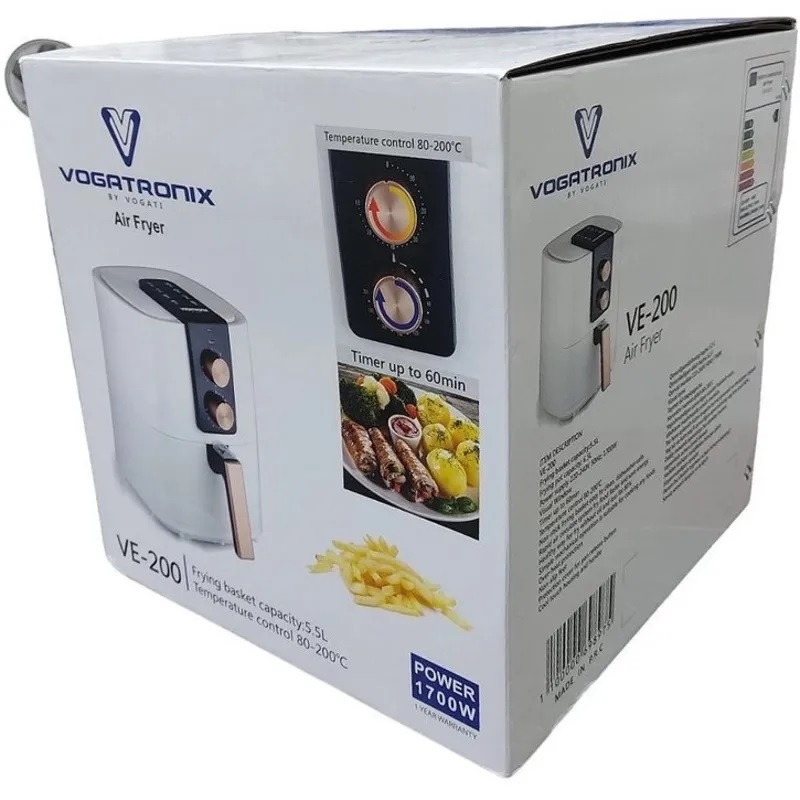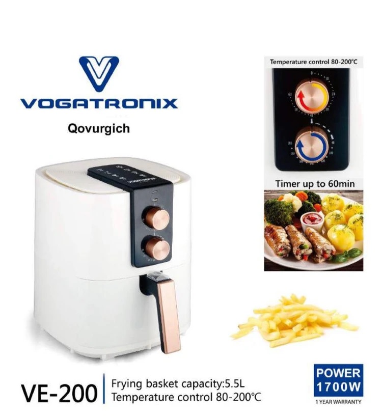 سرخ کن بدون روغن وگاترونیکس مدل VE_200 با ظرفیت مخزن 5.5 لیتر نیاز شما را برای سرخ کردن و تهیه غذاهای بدون روغن ، کم روغن و رژیمی برطرف می کند ، این سرخ کن قابلیت تنظیم دما و زمان برای گرفتن نتیجه بهتر و سرخ کردن غذا به میزان دلخواه را دارد ، فن به کار رفته در این مدل سرخ کن از نوع تمام فلز می باشد