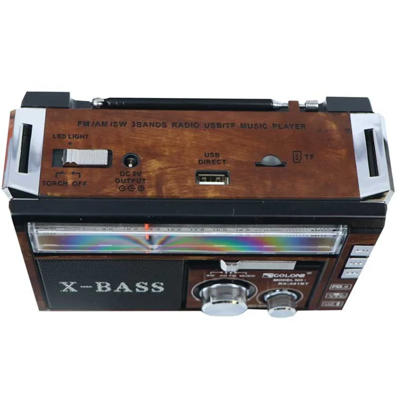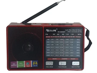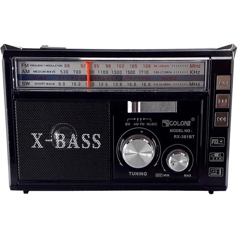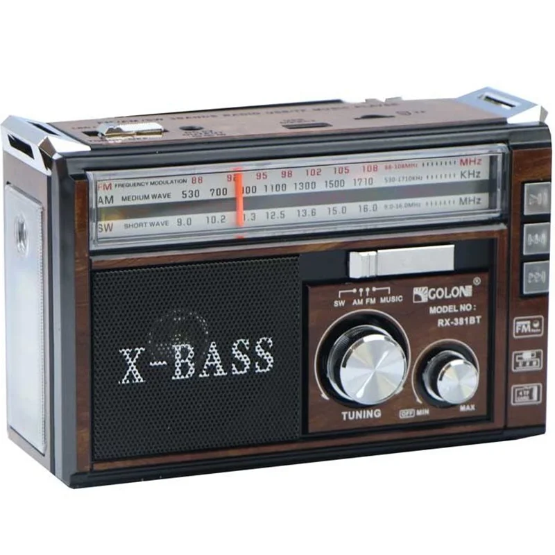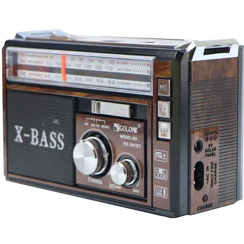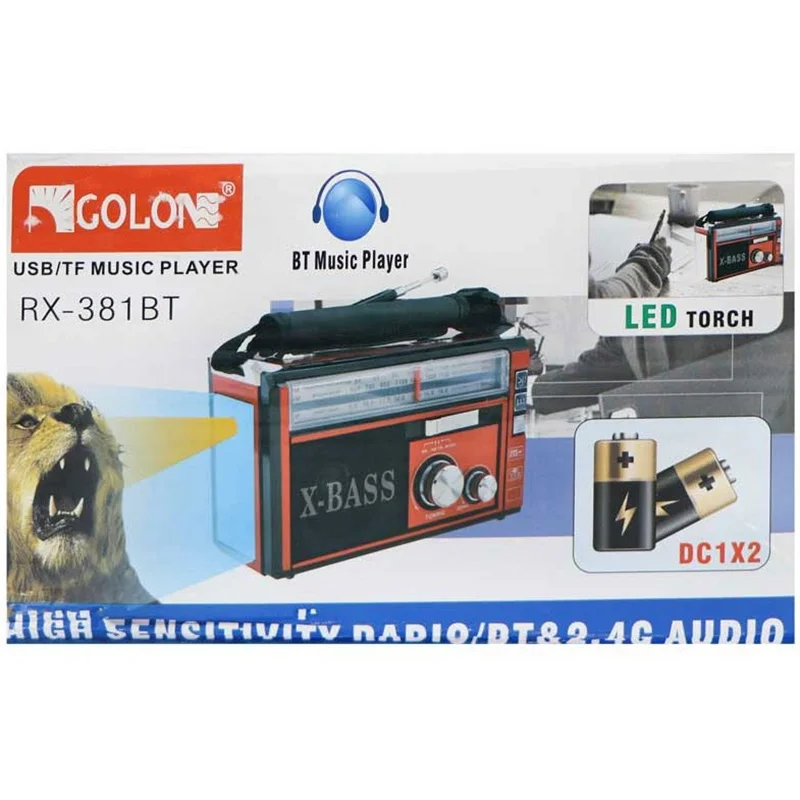یکی از معروفترین شرکتهای تولیدکننده رادیو و اسپیکر در دنیا شرکت GOLON است. محصولات این شرکت به بیش از 100 کشور دنیا صادر میشود .از ویژگیهای این شرکت میتوان به طراحی و کیفیت بالای محصولات این شرکت اشاره کرد.این رادیو قابلیت دریافت تمام فرکانسهای رادیویی(FM,AM,SW) و همچنین پخش موسیقی از طریقUSB,SD,TF طراحیشده است و کیفیت صدای بالایی دارد. رادیو اسپیکر Golon RX-381BT مجهز به فناوری بلوتوث است. از مزایای آن میتوان به آنتن تلسکوپی، چراغقوه، بلوتوث و طراحی زیبای آن اشاره کرد. این رادیو دارای باتری شارژی بوده که قابلیت استفاده به صورت سیار و بدون نیاز به برق در مواقع اضطراری را دارد .همچنین این اسپیکر قابلیت استفاده با باتری و همچنین اتصال مستقیم به برق شهری را دارا است.